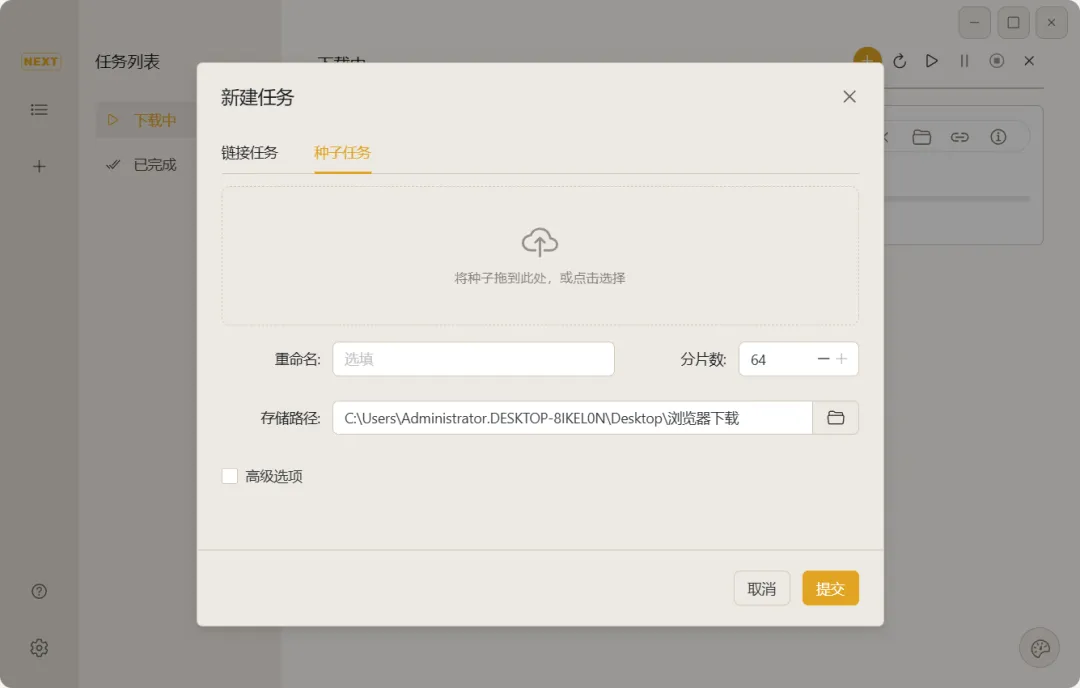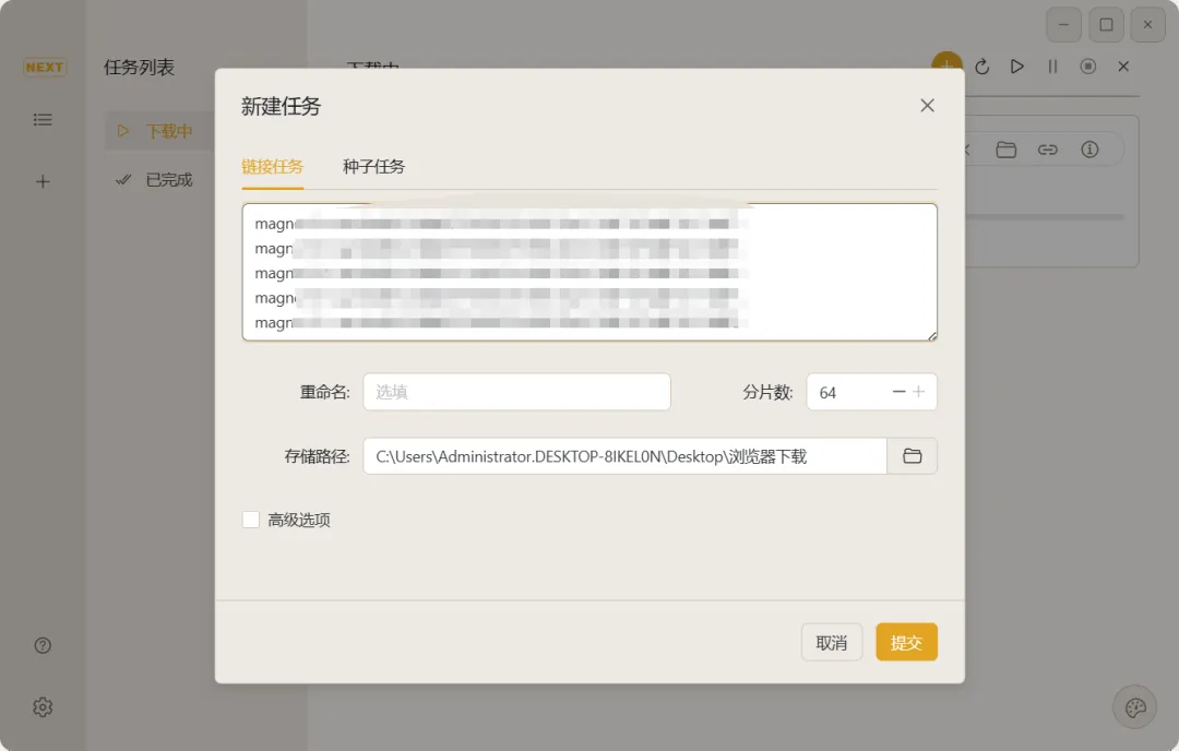 还可以设定线程数、存储路径及其他高级选项。想存哪里存哪里,想开几个线程自己定。提交后自动开始下载,不用盯着。