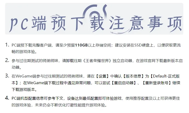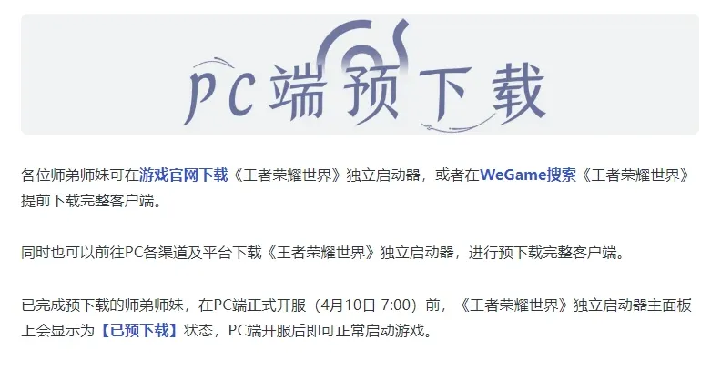 兄弟们,终于要来了!《王者荣耀:世界》PC端马上已经可以预下载,开服时间也正式敲定。别问,问就是赶紧去清硬盘,这次的体积可不是开玩笑的。