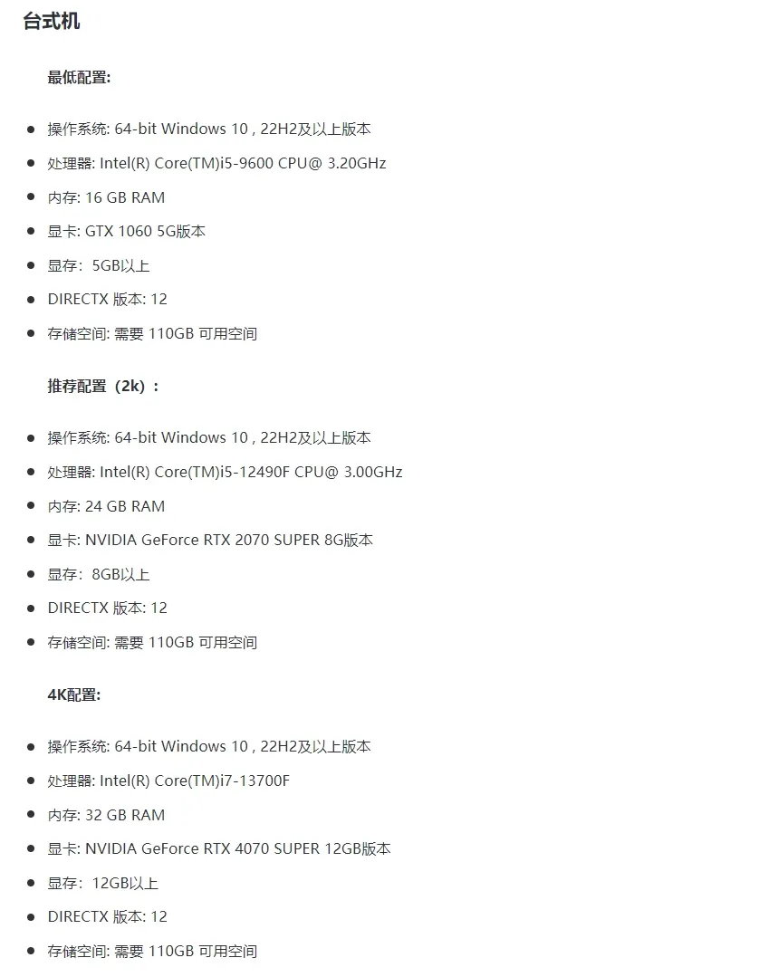 台式机:最低 GTX 1060 5G 就能跑;想爽玩 2K 推荐 RTX 2070 SUPER;4K 画质则需要 RTX 4070 SUPER。