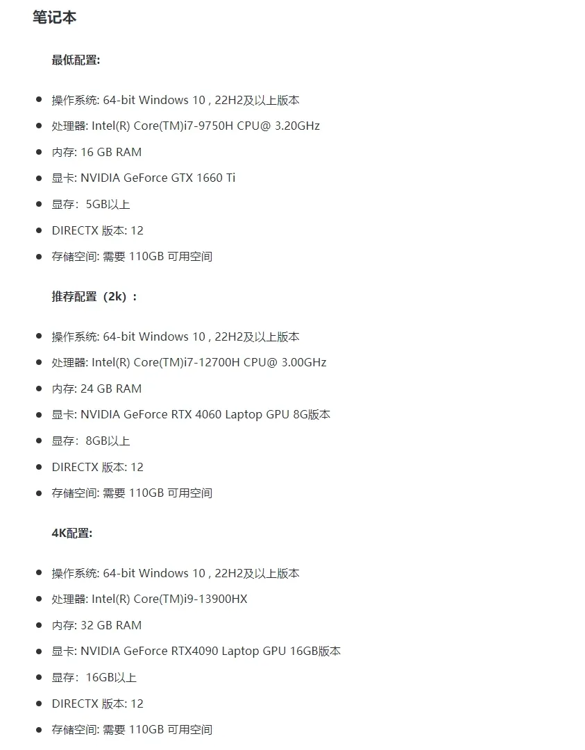 笔记本:最低 GTX 1660 Ti 起步;2K 推荐 RTX 4060 Laptop;4K 顶配则要 RTX 4090 Laptop。