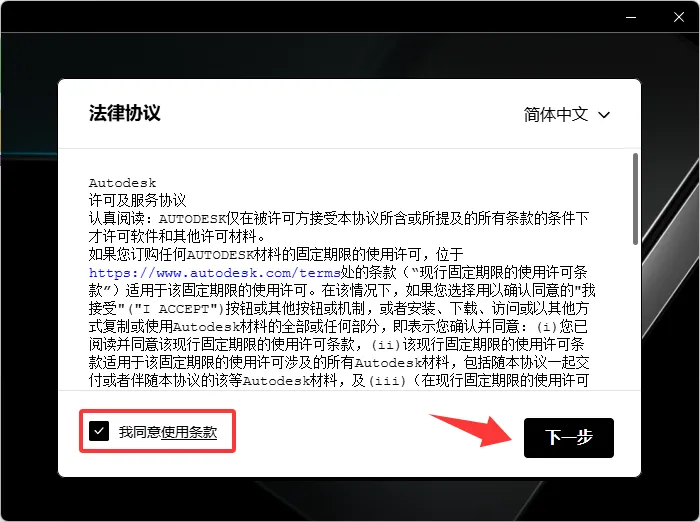 第2步,【勾选】我同意使用条款 点击“下一步”