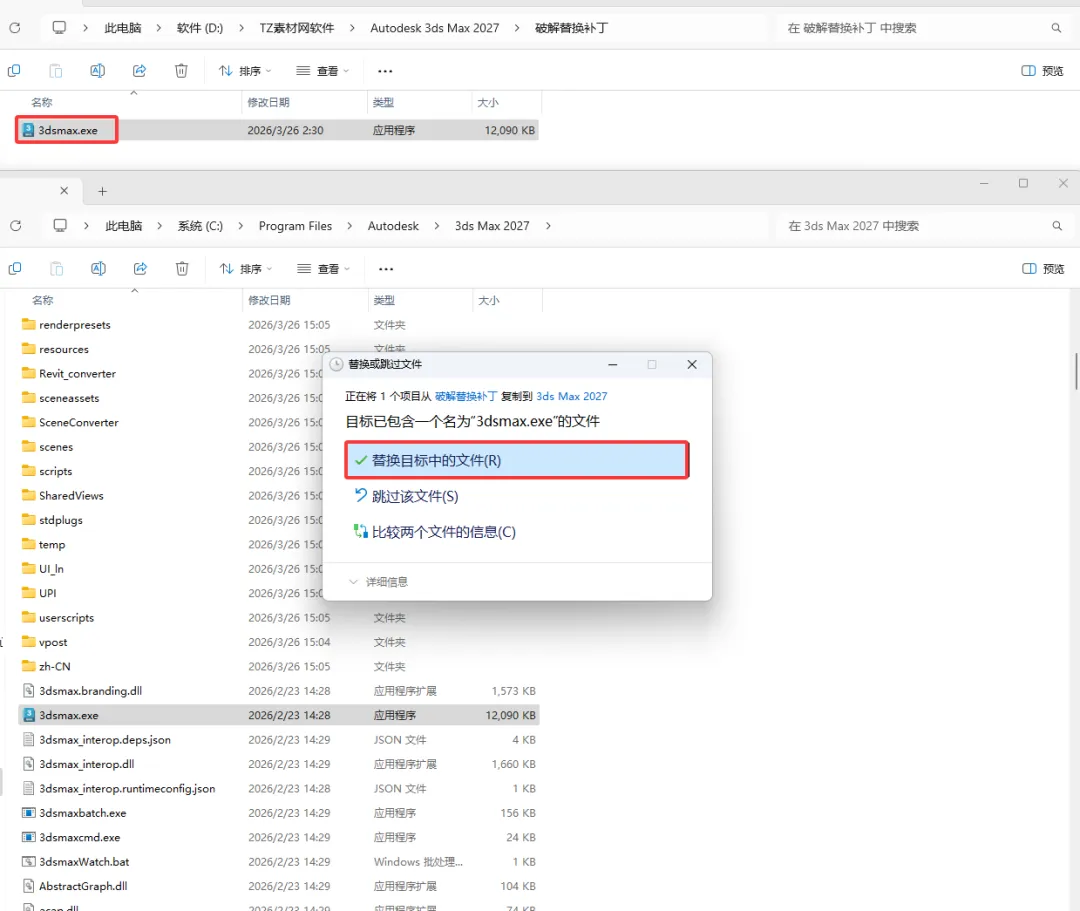 第9步,将“3dsmax.exe”文件【替换】到3Dmax软件的安装目录中;