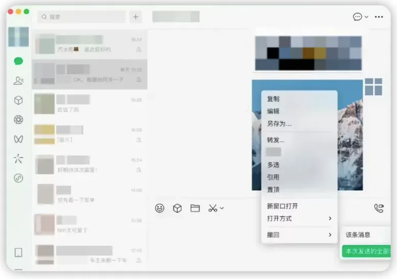 新版微信在整体界面和二级菜单中加入了当下非常流行的“透明毛玻璃”效果。聊天界面的背景也从略显沉闷的浅灰色变成了纯白色。整个界面看起来更加通透、现代,看久了眼睛也不会觉得累。对于每天对着电脑 8 小时的打工人来说,这波视觉优化绝对要给好评。