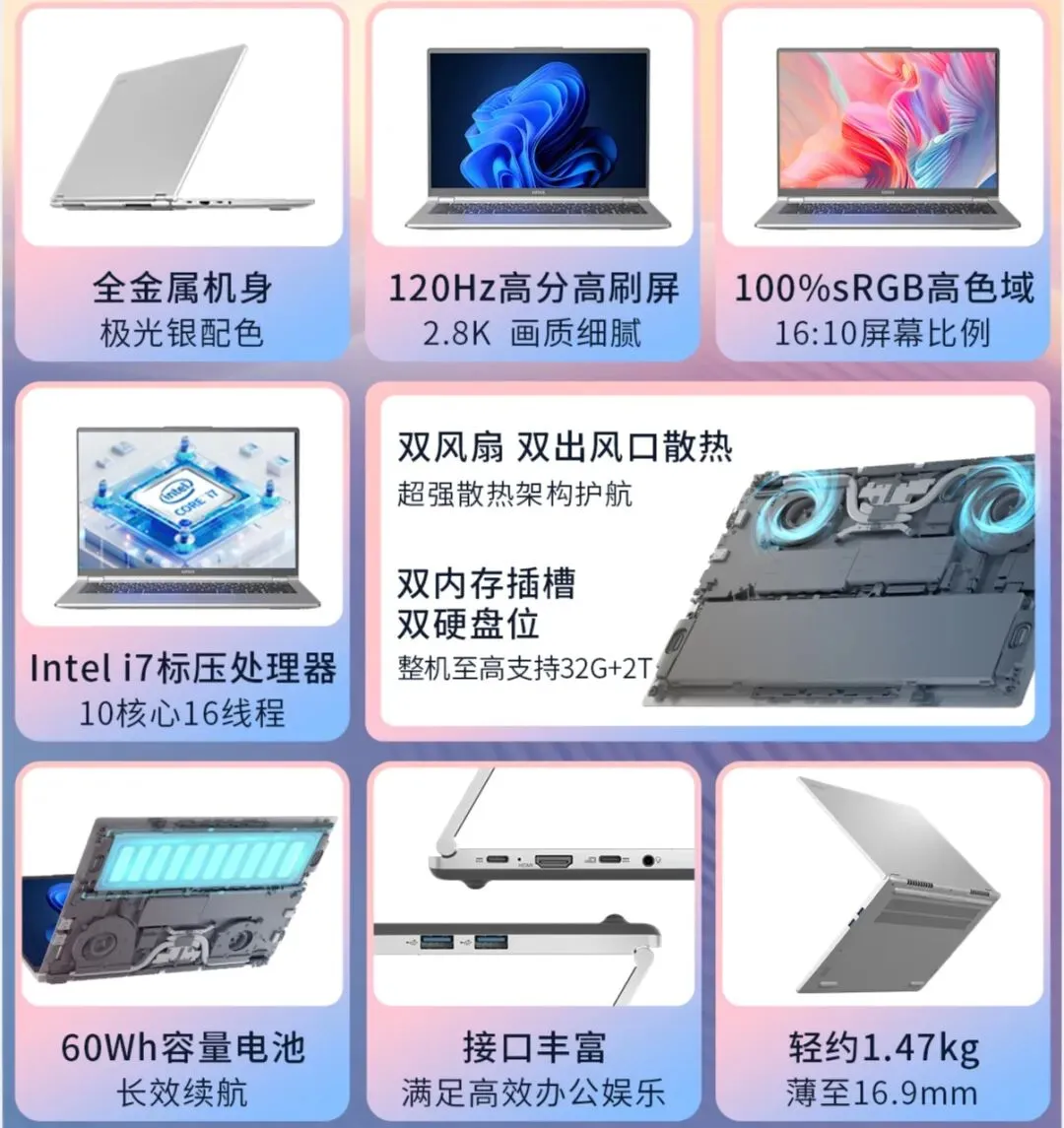 屏幕:14英寸IPS 16:10 2880*1800(2.8K) 100%sRGB 120Hz