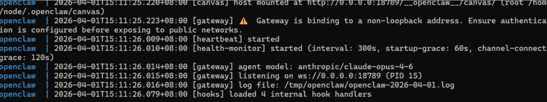 看到 [gateway] listening on ws://0.0.0.0:18789 的日志,说明启动成功!