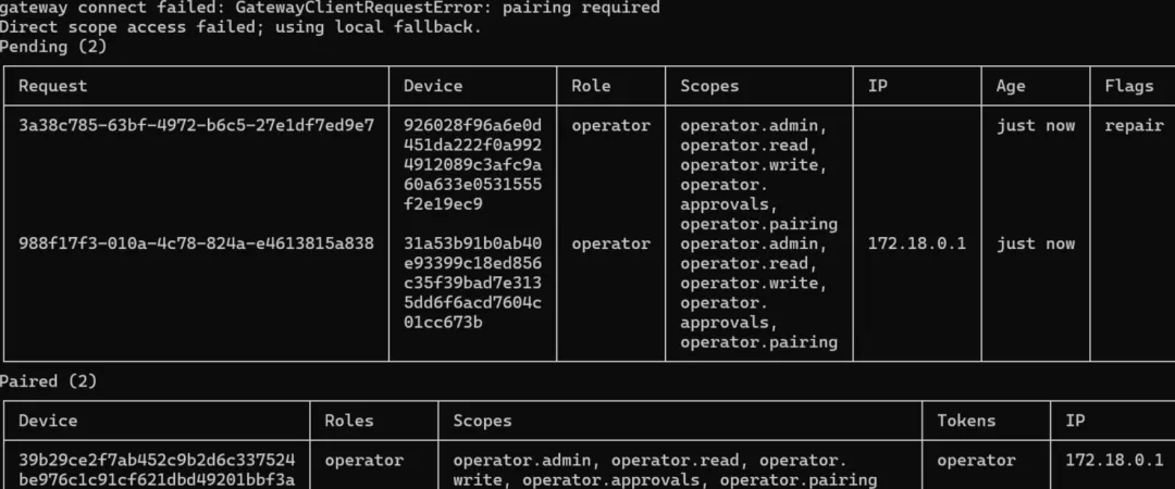 由于 Docker 有自己的内部网络,即使配置了 mode: “local”,Gateway 也会把 Docker NAT 视为外部连接,需要手动配对。
