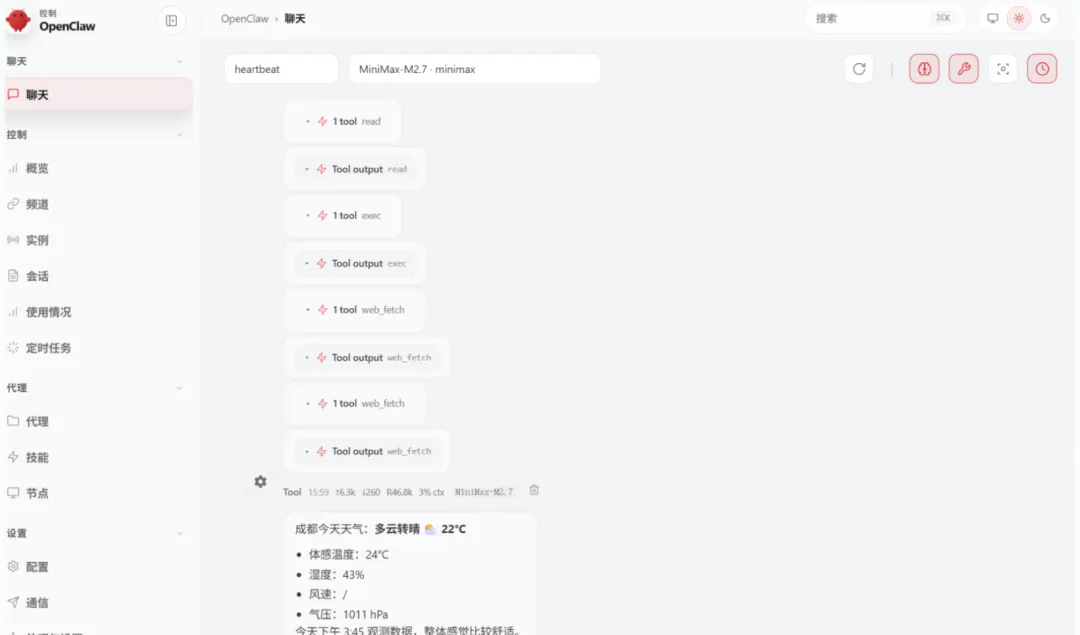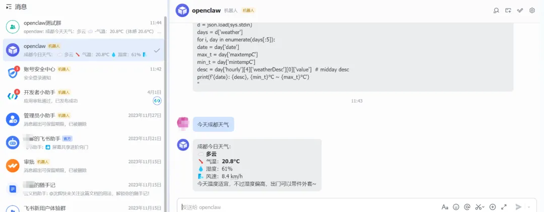 到这里,你的 OpenClaw 已经部署完成,并且成功接入了飞书。现在你可以: