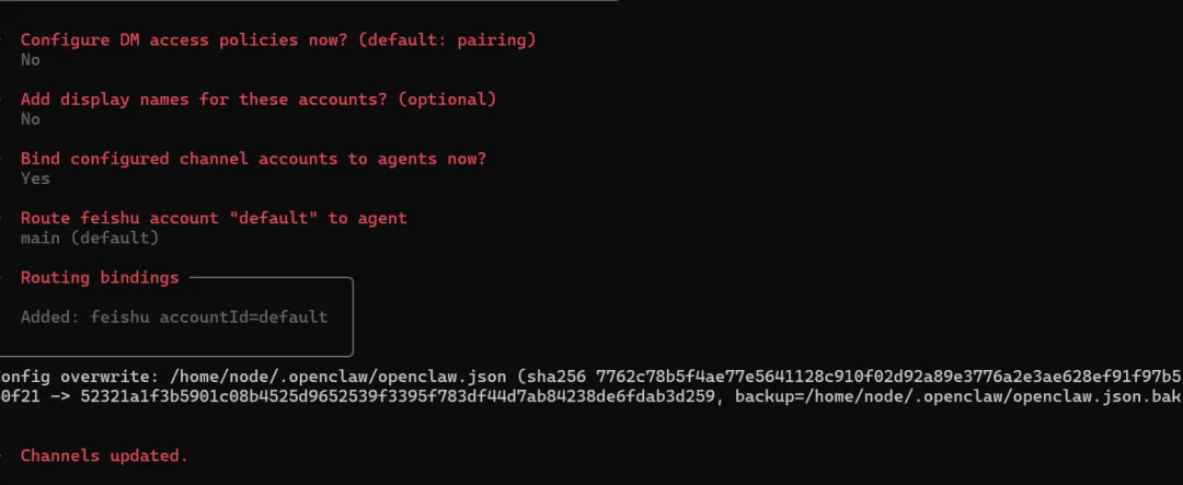 选择 Feishu/Lark (飞书) 输入 App Secret 和 App ID 连接模式选择 WebSocket 长连接 国内用户选择 Feishu 频道 群聊策略可选 Open(响应所有群聊)或 Allowlist(仅白名单群聊)