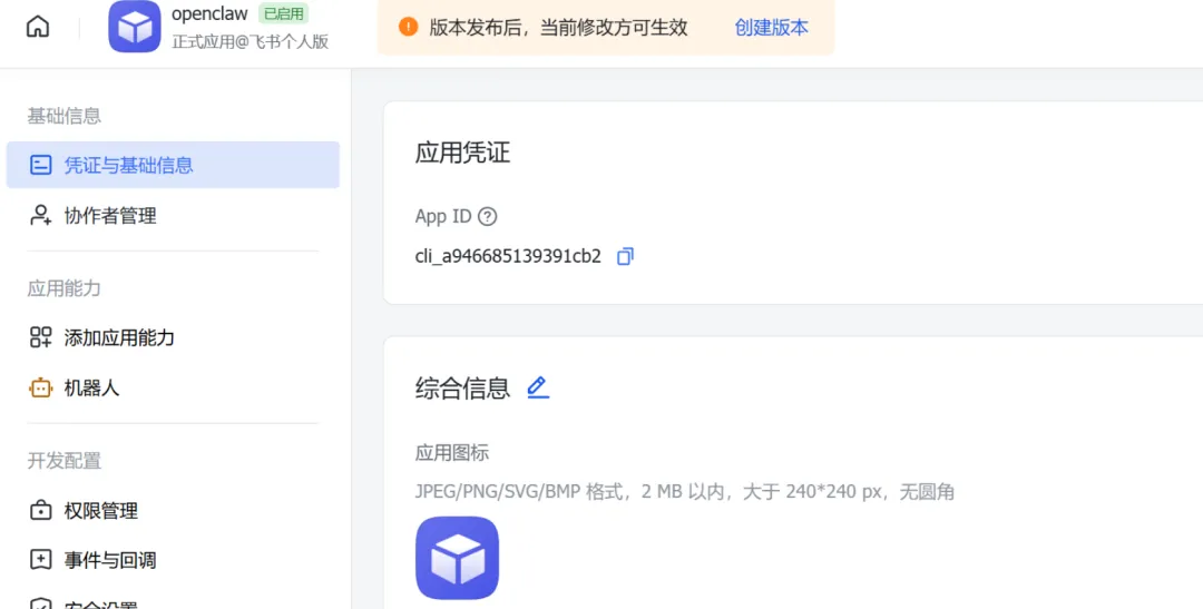 App ID(通常以 cli_ 开头) App Secret(注意保密,别泄露)