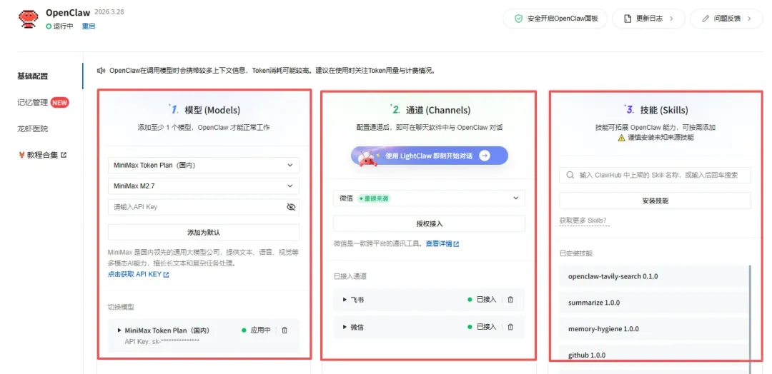 4.(1)选择模型,选择厂商,复制api,添加(2)选择对话通道,可以微信、飞书等,扫码登录即可,非常方便(3)技能,可以不装,内置很多实用技能,建议安装网络搜索技能multi search engine,不然没法搜索网上资料。