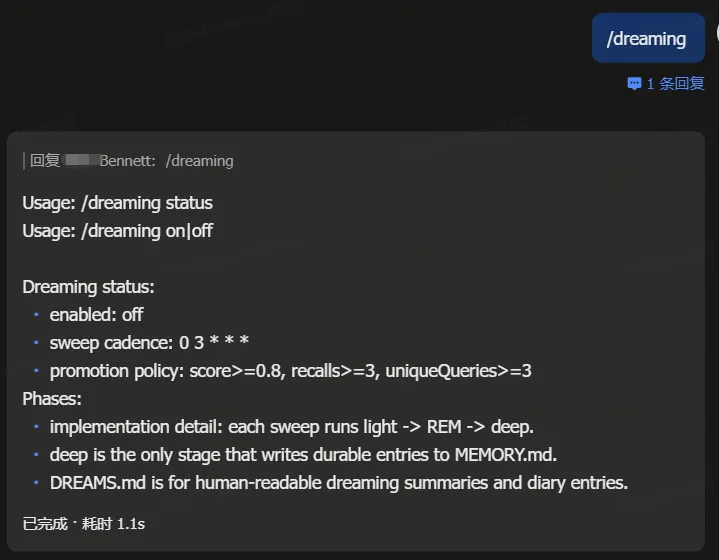 /dreaming statusDreaming status:- enabled: off- sweep cadence: 0 3 * * *# 每天凌晨 3:00- promotion policy:# 记忆提升条件score >= 0.8# 质量分 ≥ 0.8recalls >= 3# 被引用 ≥ 3 次uniqueQueries >= 3# 独立查询 ≥ 3 次