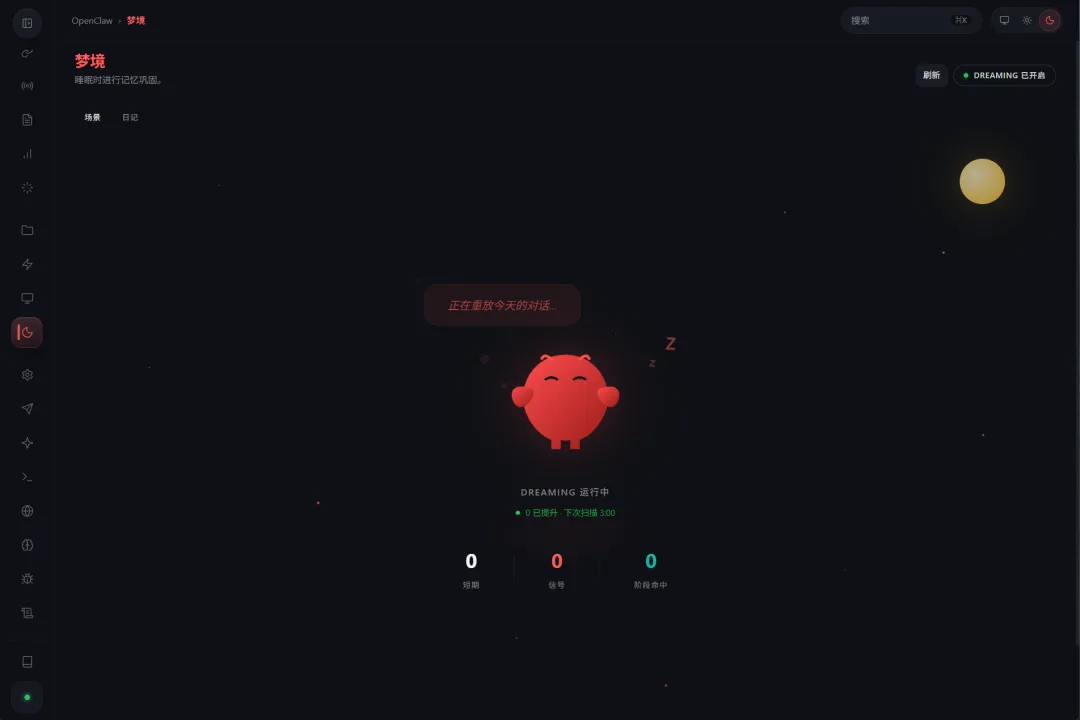 梦境日记最终写入 ~/.openclaw/workspace-moss-agent/DREAMS.md目前由于刚升级且处于活跃状态,Moss 可能还没积累足够的"睡意"来触发这段 Prompt