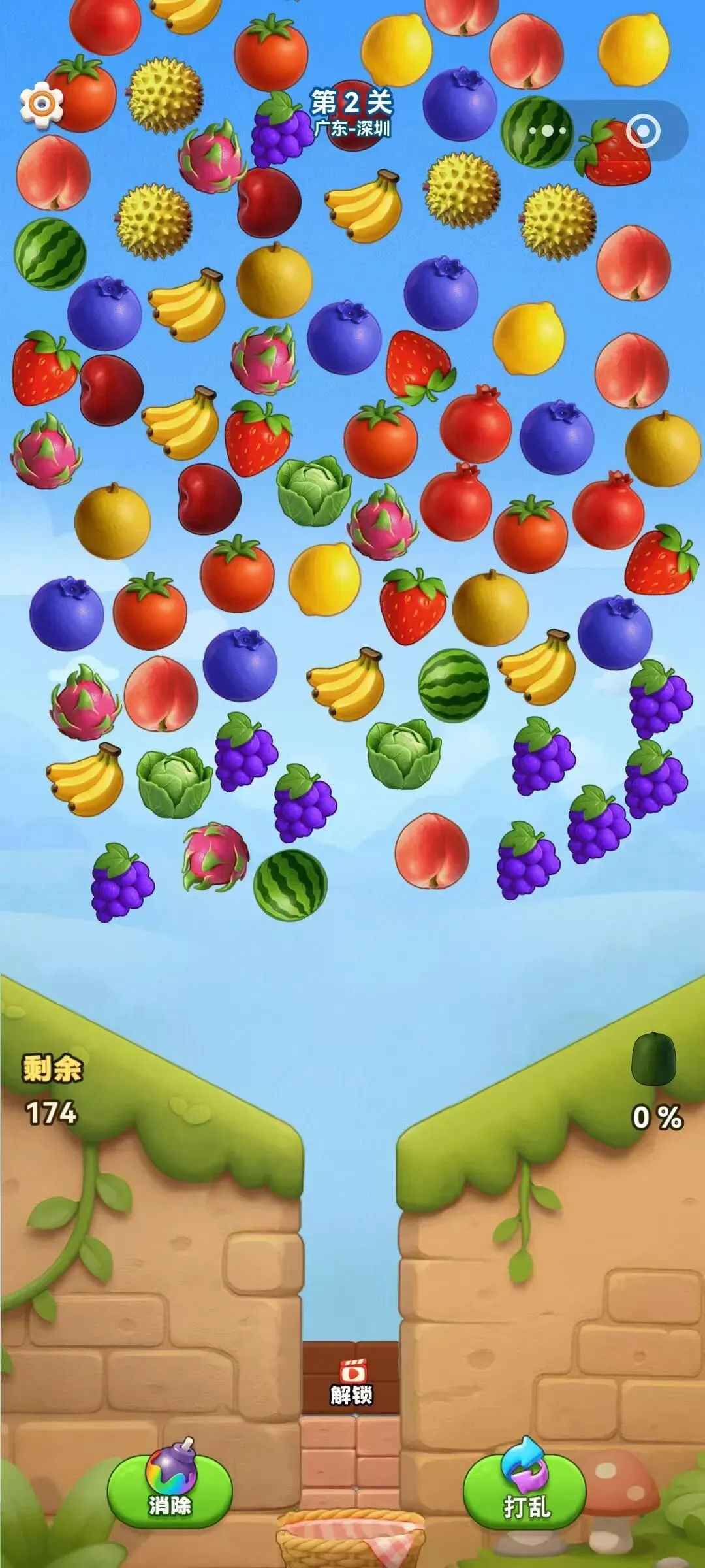经典水果消除类,画风清新,玩起来很治愈。点击屏幕上的水果,让它们下落到底部卡槽,相邻两个相同水果就能自动消除,把所有水果消完就算通关。