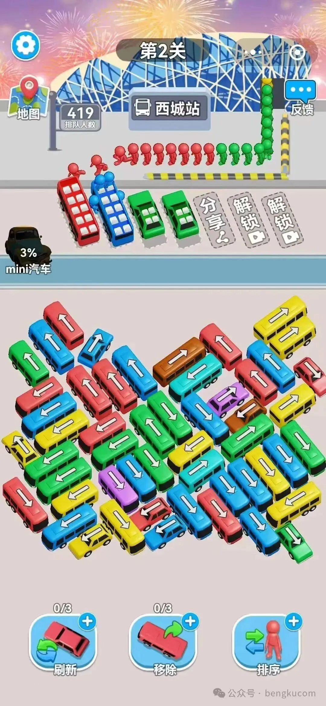 箭头解谜+消除融合玩法,近期很火。点击车辆按照箭头方向开出,搭载对应颜色的乘客,全部乘客送走就算通关,需要规划发车顺序,策略感拉满。