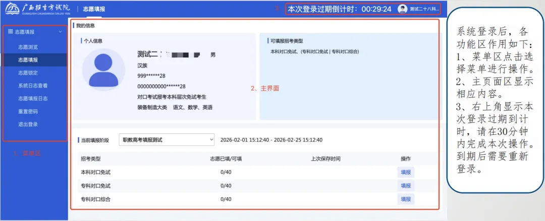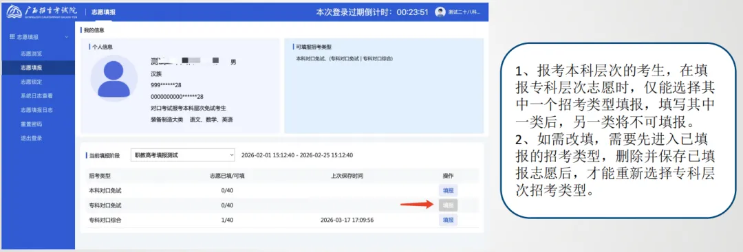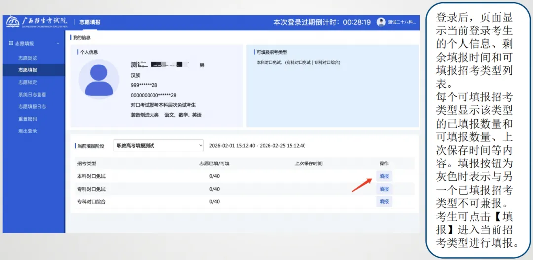 考生登录后,页面显示当前登录考生的个人信息、剩余填报时间和可填报招考类型列表,考生可根据报名时的类型点击【填报】进入当前招考类型进行填报。