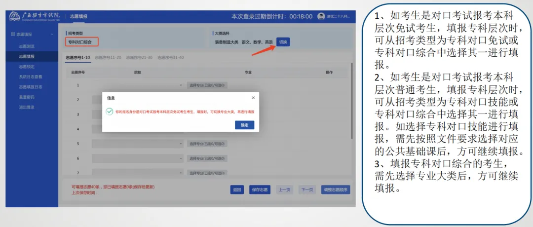 点击【招考类型】选择自己相对应的报考类型;
