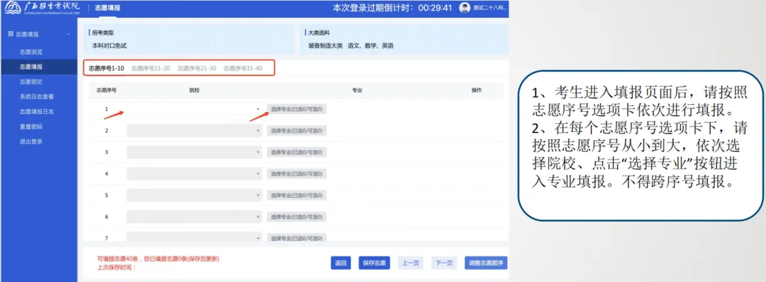 考生进入填报页面后,请按照志愿序号选项卡依次填报。不得跨序号填报。