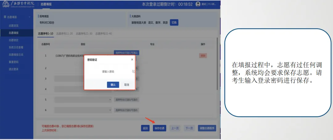 在填报过程中,志愿有过任何调整,系统均会要求保存志愿。请考生输入登录密码进行保存。