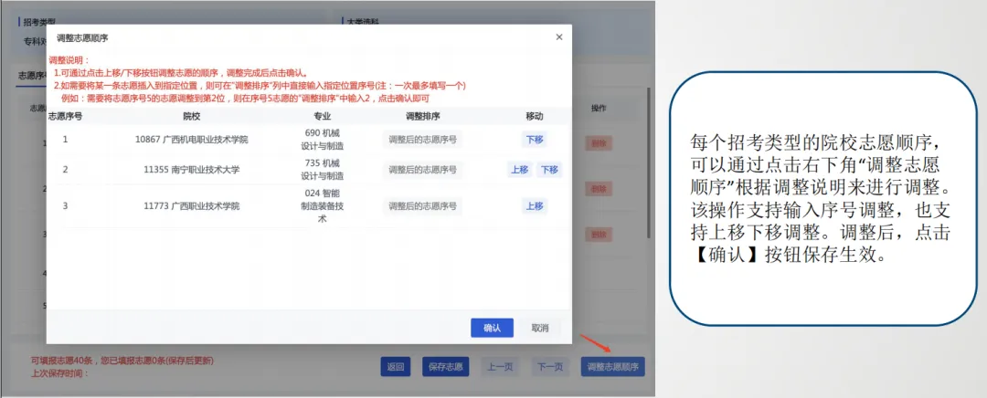 考生可以通过点击右下角“调整志愿顺序”g根据调整说明来进行调整。