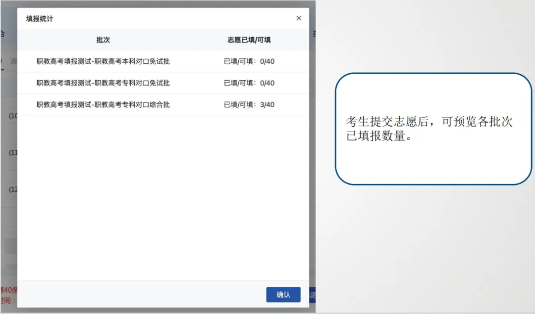 考生提交志愿后,可预览各批次已填报数量。