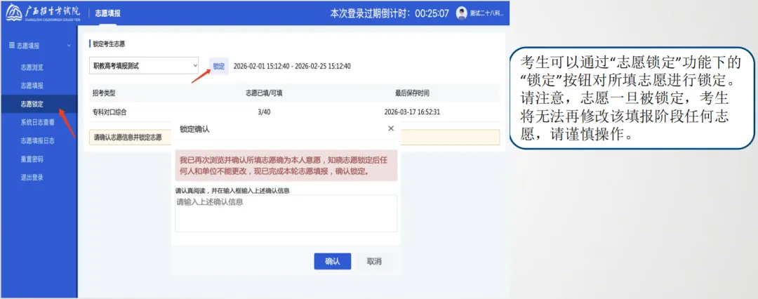 注意:志愿一旦被锁定,考生将无法再修改填报阶段的任何志愿,请谨慎操作。