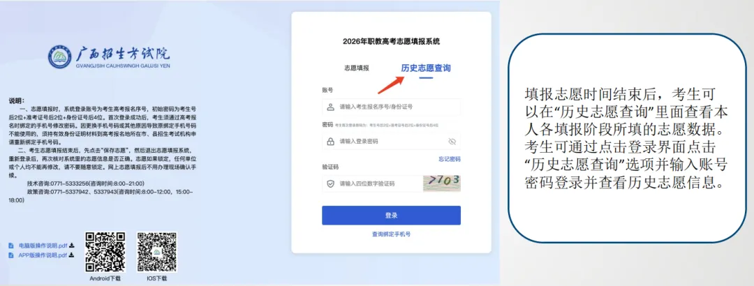 考生可通过点击登录界面点击“历史志愿查询”选择并输入账号密码登录并查看历史志愿信息。