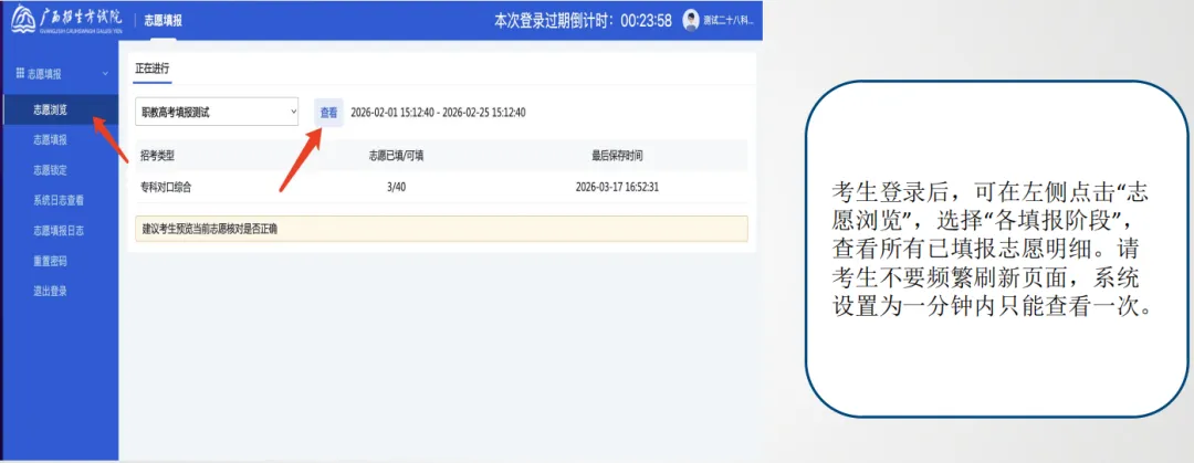 考生登录后,可在左侧点击“志愿浏览”,选择“各填报阶段”,查看所有已填报志愿明细,系统设置为一分钟内只能查看一次。