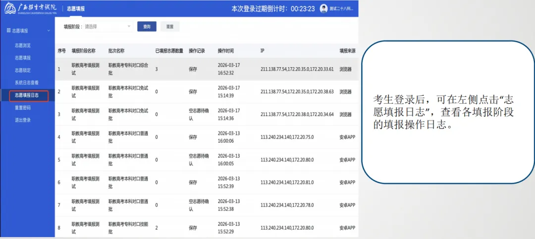 考生登录后,可在左侧点击“志愿填报日志”,查看填报阶段的填报操作日志。