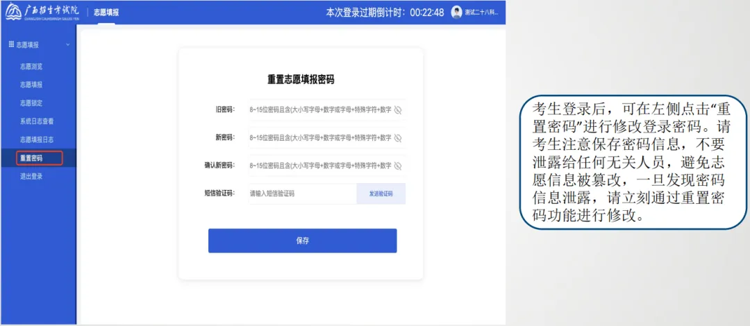 考生登录后,可以在左侧点击“重置密码”进行登录密码修改。