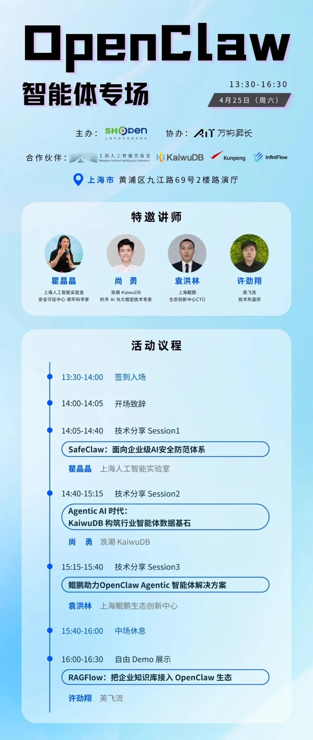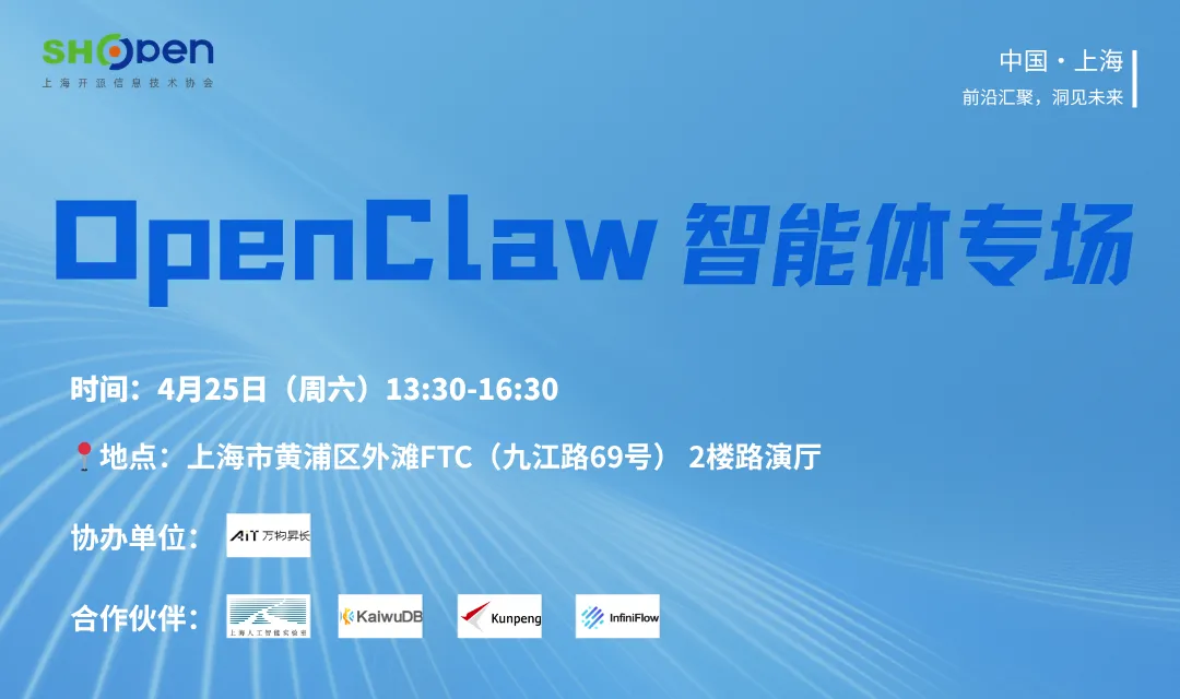 当前 AI 智能体技术快速迭代,开源生态成为开发者创新核心阵地。OpenClaw作为可本地部署、具备自主执行能力的开源智能体框架,凭借高效落地与灵活扩展特性,备受技术圈关注。为进一步放大平台价值,凝聚开发者力量,特举办本次OpenClaw智能体专场活动。本次活动聚焦技术分享、生态共建与社区联动,面向广大开发者全面展示OpenClaw核心能力、应用场景与开发路径,助力OpenClaw生态持续繁荣,赋能更多开发者实现智能体创新落地。
