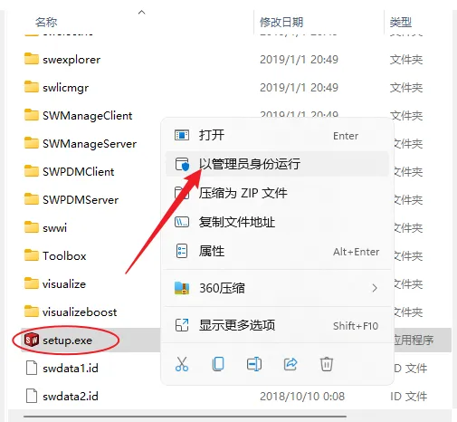 11.打开解压后的安装包,进入SW2019文件夹,右键以管理员身份运行Setup安装程序。