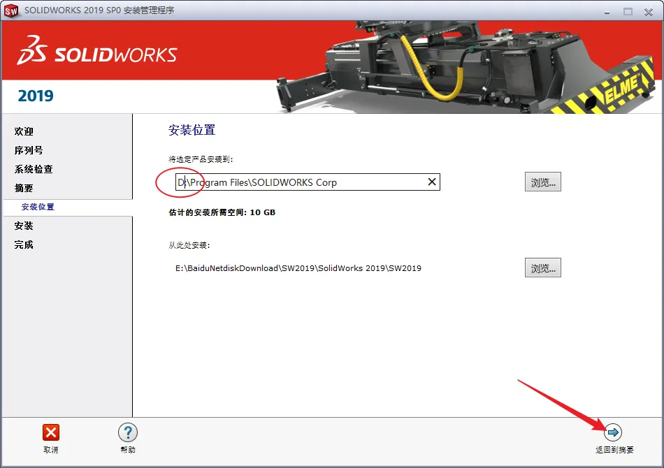 17.直接将C修改为你需要安装到的盘,本例安装到D盘,点击返回摘要。