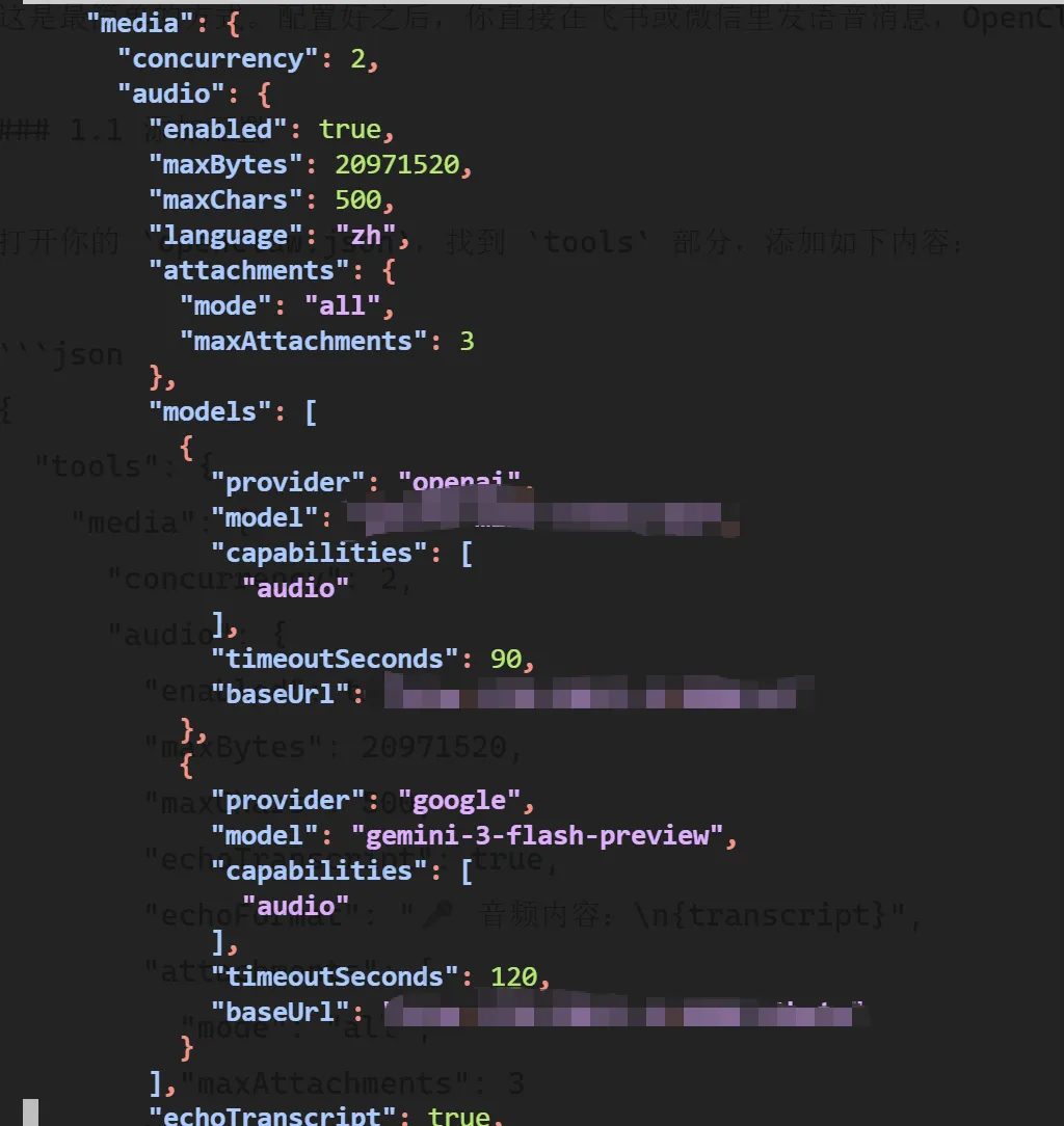 确认已重启 OpenClaw 检查 tools.media.audio.enabled是否为true检查 models.providers里的baseUrl和apiKey是否正确查看日志: openclaw logs,搜关键词 "audio" 或 "transcribe"