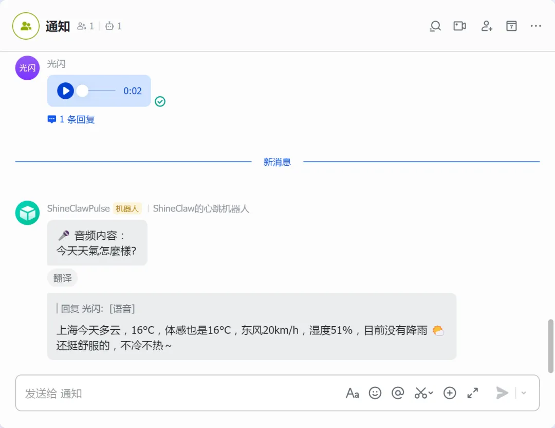 这是最简单的方式。配置好之后,你直接在飞书或微信里发语音消息,OpenClaw 会自动转录并回复你。