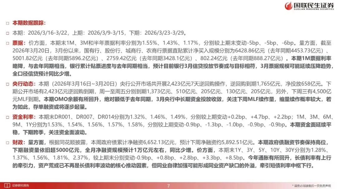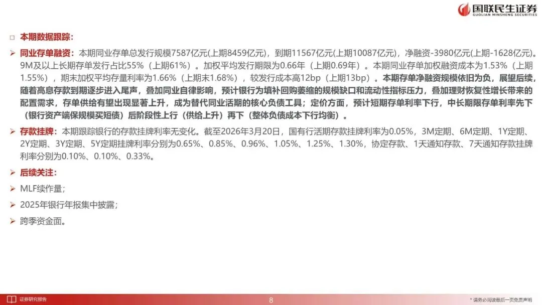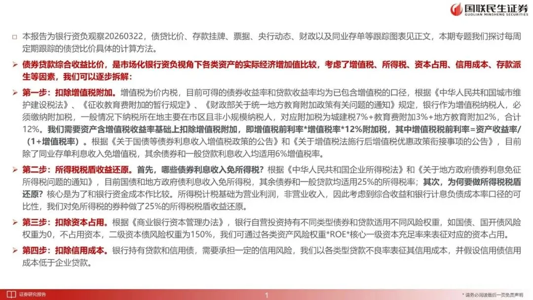 本报告为银行资负观察20260322,债贷比价、存款挂牌、票据、央行动态、财政以及同业存单等跟踪图表见正文,本期专题我们探讨每周定期跟踪的债贷比价具体的计算方法。