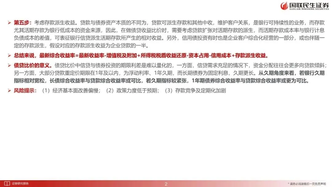 债券贷款综合收益比价,是市场化银行资负视角下各类资产的实际经济增加值比较,考虑了增值税、所得税、资本占用、信用成本、存款派生等因素,我们可以逐步拆解