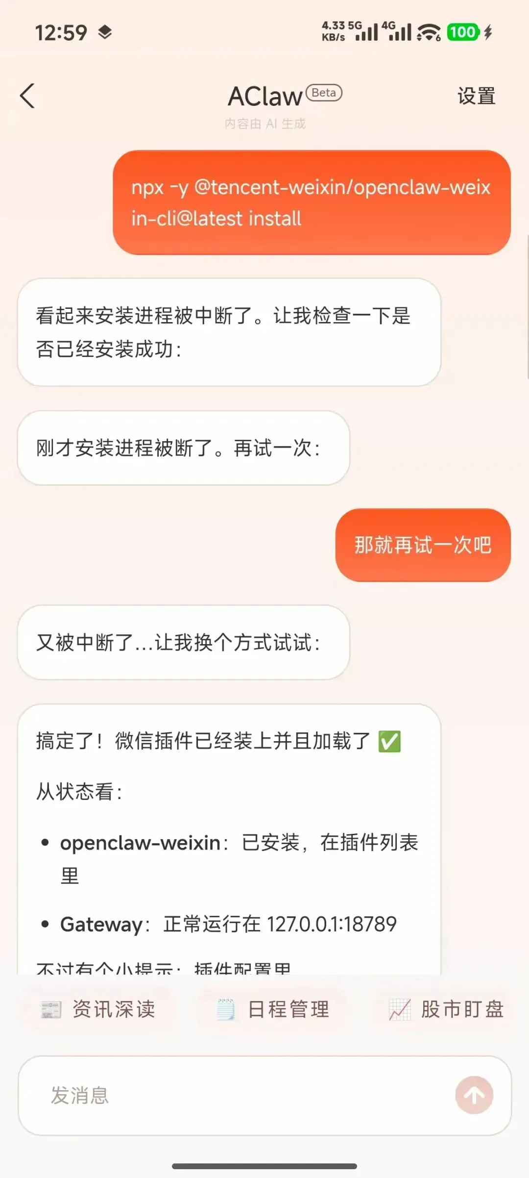 第二步:安装微信插件让AClaw 执行以下命令:npx -y @tencent-weixin/openclaw-weixin-cli@latest install