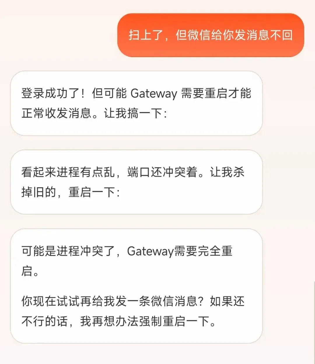 “微信已经扫码登录,但是通过微信给你发消息不回,请帮我解决。”