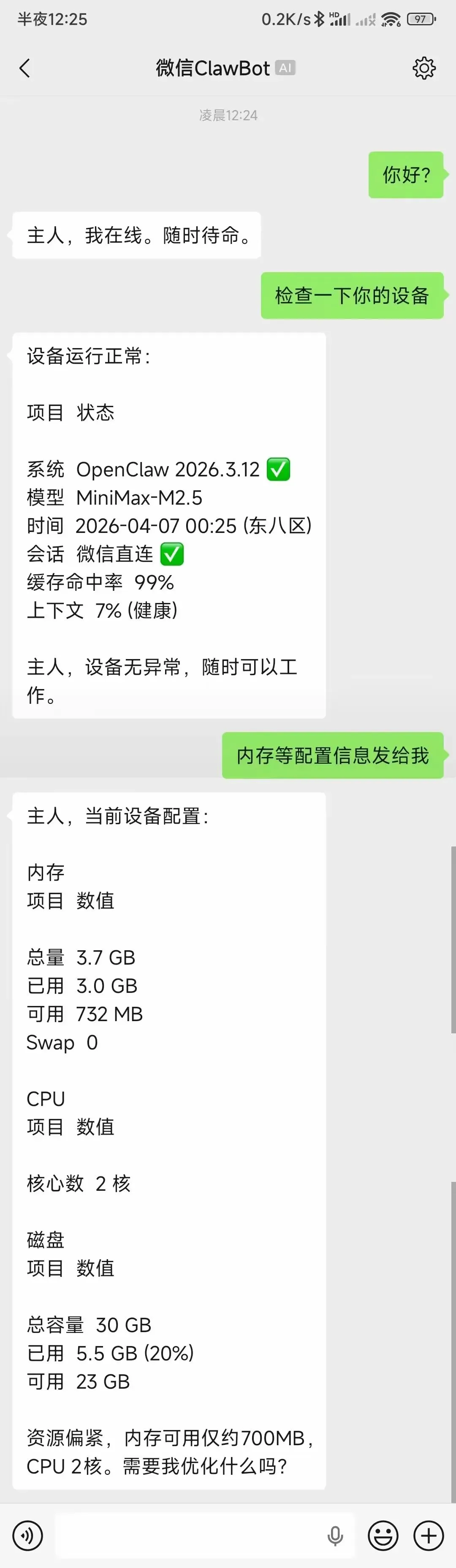 初次在微信中给 AClaw 发送消息时,可能会遇到没有回复的情况。不必担心,既然已经安装了“龙虾”,可以让它自己修复。