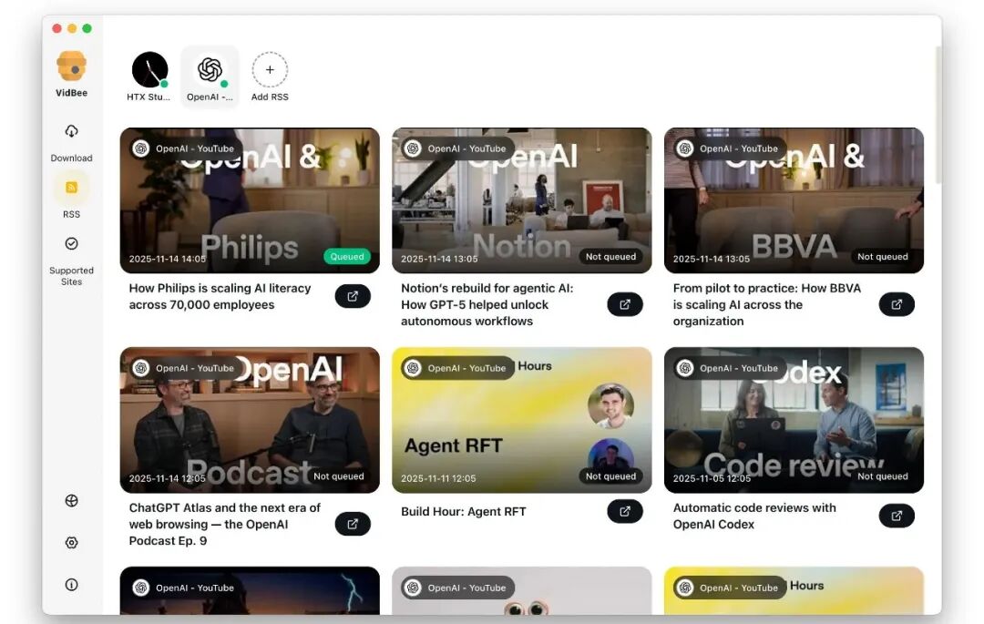 1. 添加你喜欢的YouTuber、B站UP主的RSS源 2. VidBee会在后台自动监控这些源 3. 一旦他们发布新视频,VidBee会自动下载到本地