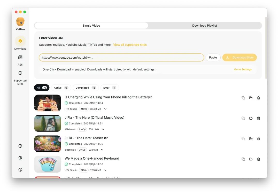 我实际使用VidBee下载了几个视频,整体体验非常流畅: