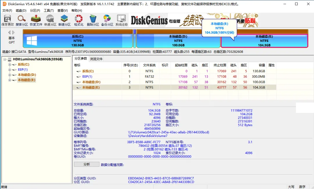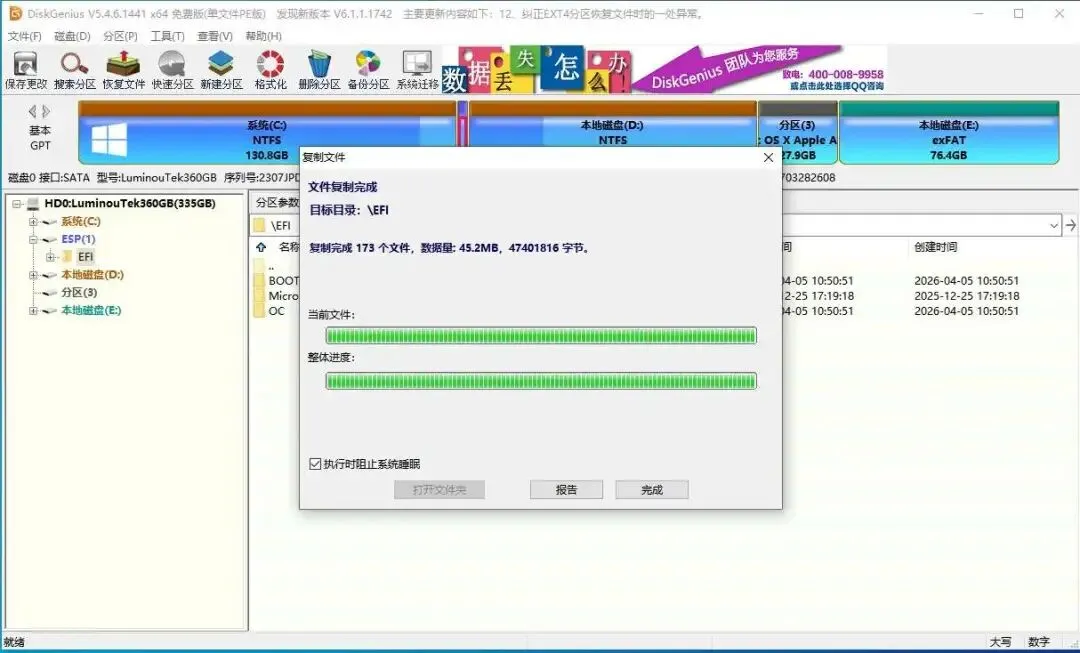 (5)创建 ≥200MB 的 ESP 引导分区;若笔记本已有 ESP 分区(部分机型显示为 System 分区,同属 ESP 范畴)且 ≥200MB,可跳过此步。完成后最小化 / 关闭 DiskGenius 即可。