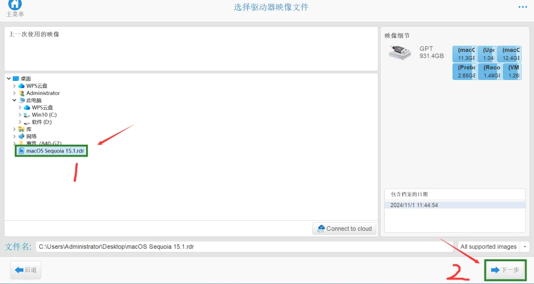 (14)按下图操作:选中桌面的 rdr 格式恢复版镜像 → 点击「下一步」。