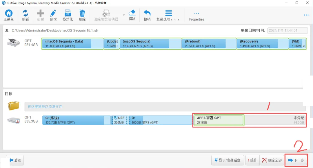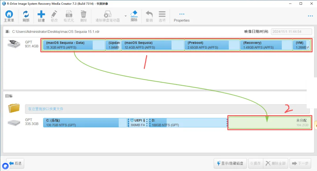 (15)按下图操作:选中 1 区,拖动箭头至未分配空白盘 2(即 macOS 装机盘)。