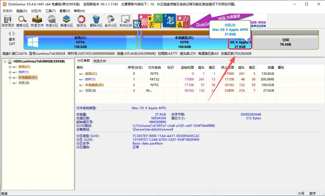 (2)打开 DiskGenius,划分 / 选定 macOS 装机盘(示例:E 盘)。