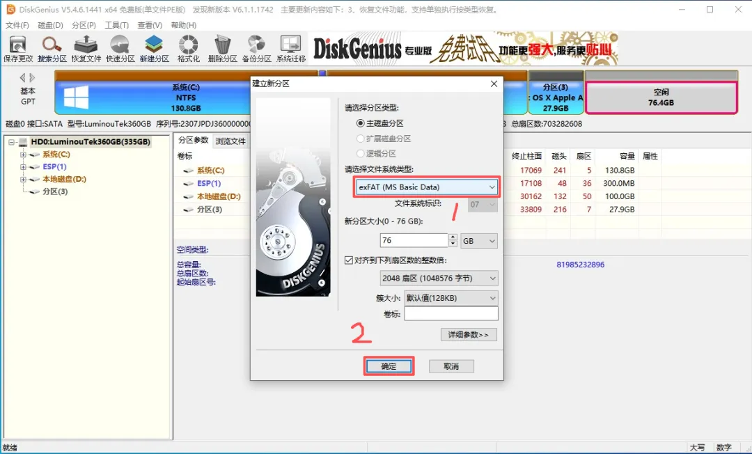 (21)选中「空闲(76.4GB)」,右键 → 建立新分区 → 文件系统类型选择 exFAT(MS Basic Data) → 点击确定。