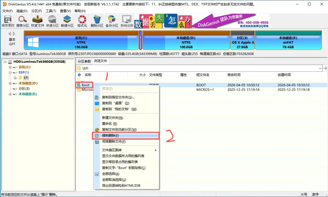 (24)右键删除 ESP / EFI 分区内原有 Boot 文件夹(强制删除)→ 将复制的 BOOT 和 OC 文件夹粘贴至 ESP / EFI 分区(BOOT、Microsoft、OC 文件夹为同级目录)→ 点击完成。