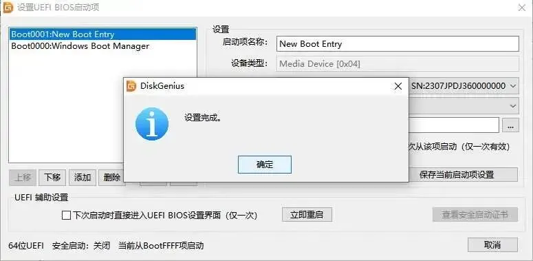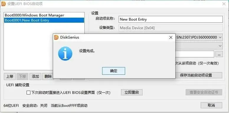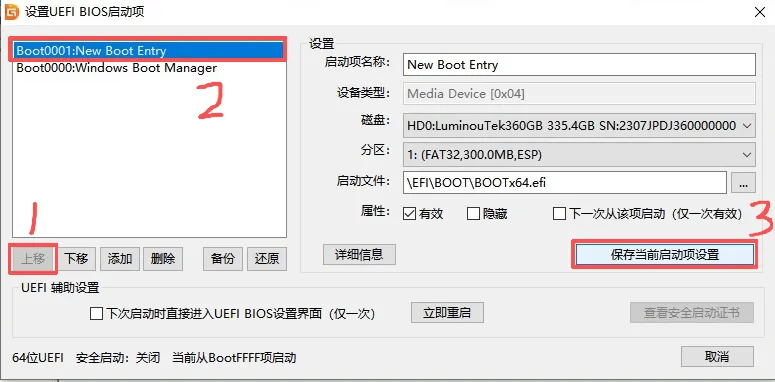 (32)选中 New Boot Entry(可自定义命名)→ 上移至首位 → 点击「保存当前启动项设置」。
