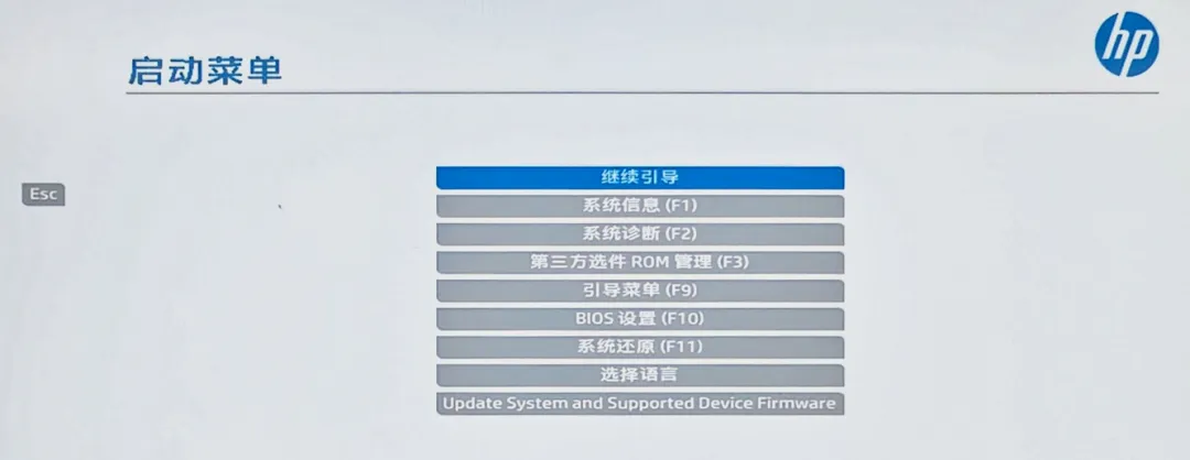 (34)关机(⚠️ 勿重启)→ 进入 BIOS。 本期案例机型:惠普笔记本,BIOS 进入方式:开机狂按 ESC 进入启动菜单 → 选择 BIOS 设置(F10)。