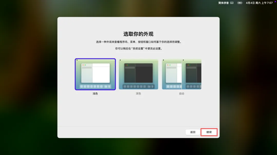 (54)选择偏好的外观 → 点击右下角「继续」。